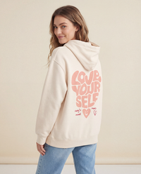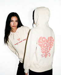 The Love Yourself Hoodie – Bone pairs soft neutrals with a joyful reminder to celebrate who you are. Featuring a playful front graphic and an oversized heart design on the back, this hoodie blends cozy comfort with an uplifting message. Warm, relaxed, and effortlessly wearable, it’s a feel-good staple designed to spread positivity wherever you go.