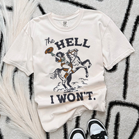 For the cowgirl who doesn’t back down, and damn sure won’t be told what to do, The Hell I Won’t Heavyweight Cowgirl Tee says exactly what’s on your mind—loud, proud, and with a little Western grit. This graphic tee brings all the sass with none of the cling, made from 100% soft ring-spun cotton and garment-dyed fabric for that perfectly broken-in feel. It’s curve-flattering, tough-girl approved, and ready for whatever the day brings—from dusty rodeos to downtown dives.
