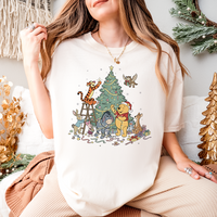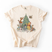 A cozy, nostalgic holiday tee featuring Winnie the Pooh and friends decorating the Christmas tree in the sweetest vintage-style illustration. Soft colors, gentle linework, and a calm winter palette make this the perfect shirt for anyone who loves quiet holiday moments, classic childhood memories, and soft, storybook-inspired style.